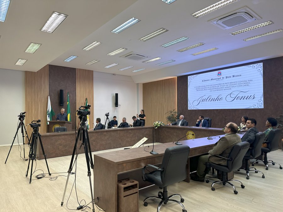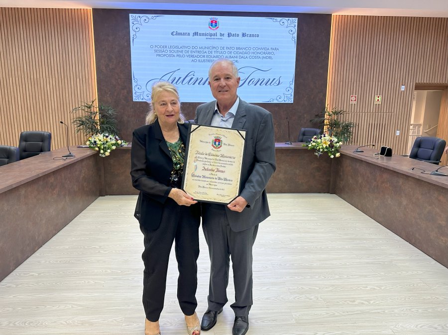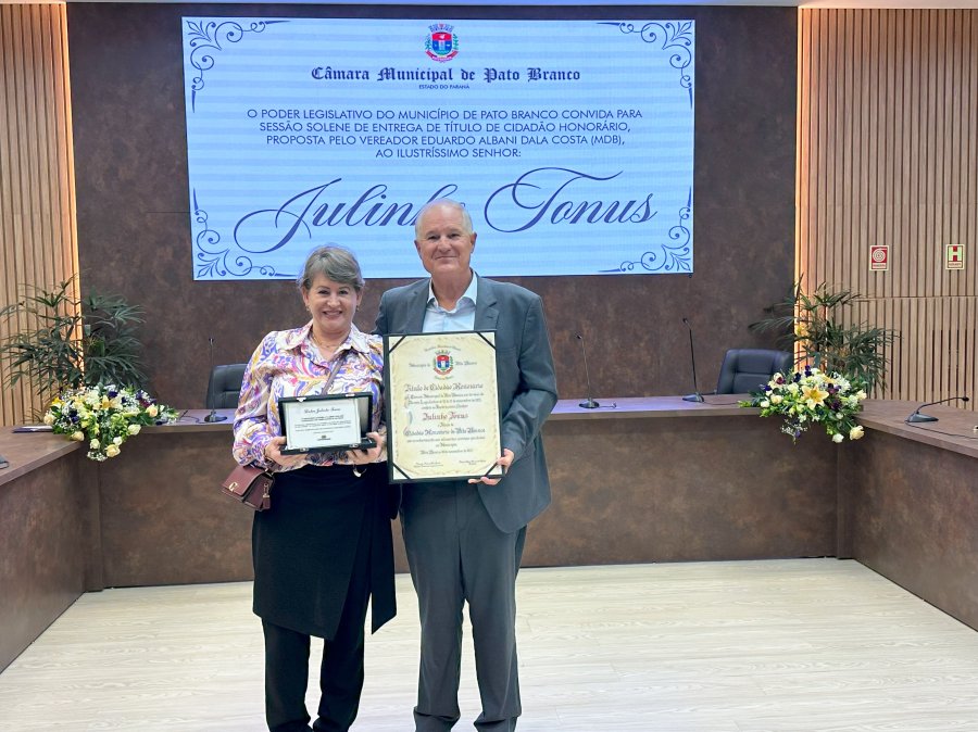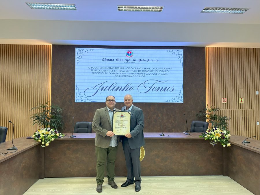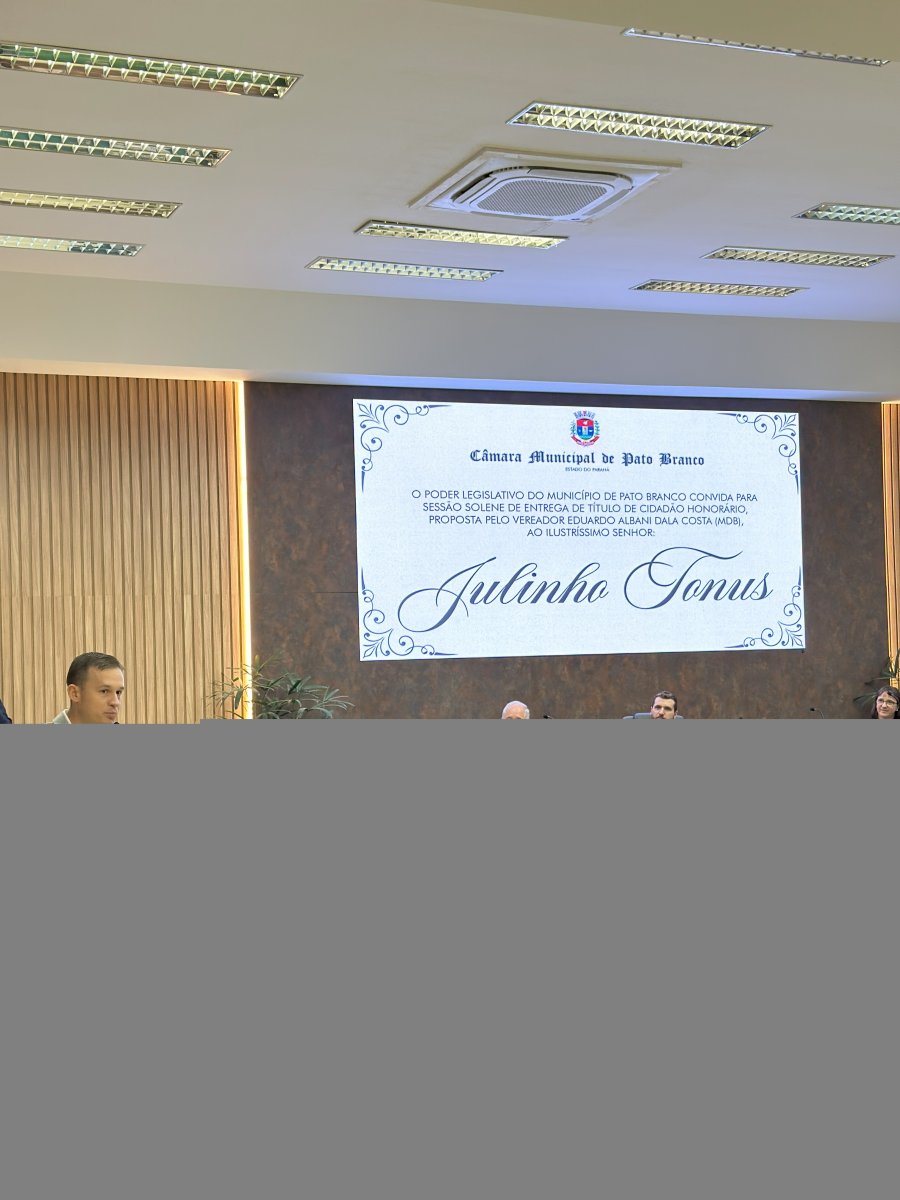 Para mais detalhes sobre a sessão solene, acesse: https://www.patobranco.pr.leg.br/institucional/noticias/legislativo-entregou-titulo-de-cidadao-honorario-de-pato-branco-para-julinho-tonus