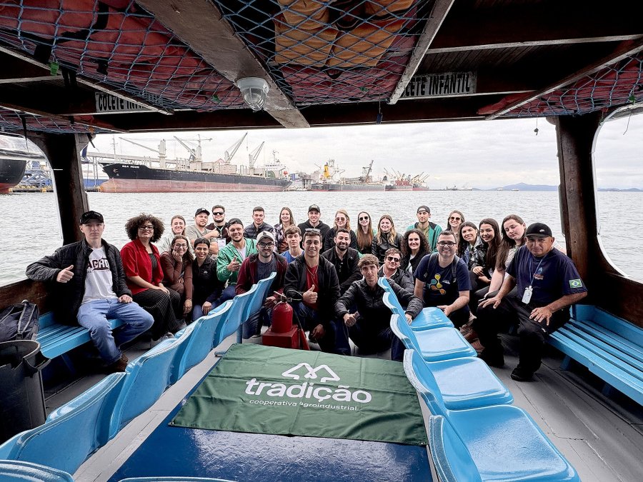 Para Natália Scalabrini, 18 anos, a viagem reforçou a importância da sucessão familiar no campo. A visita à baía de Paranaguá trouxe uma noção maior de como os grãos da propriedade chegam até o porto. Sempre ouvimos falar sobre as embarcações, mas vivenciar isso foi muito positivo. Esse cuidado da Tradição com os cooperados e seus filhos faz a gente se sentir parte.