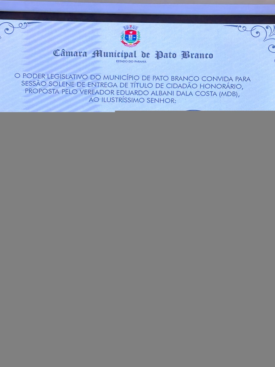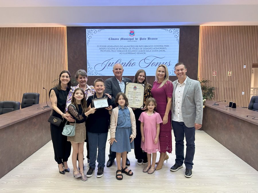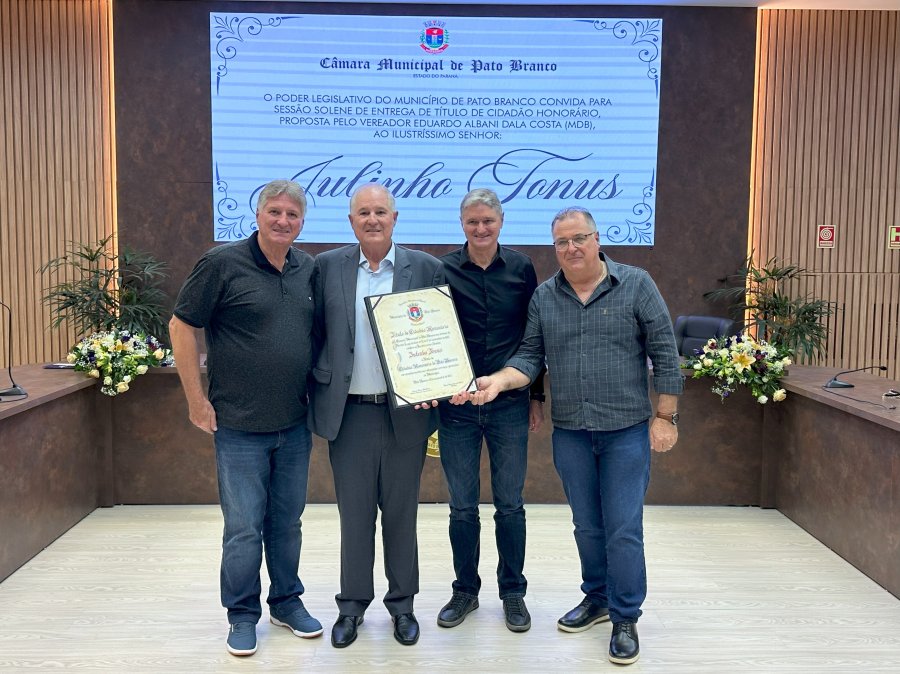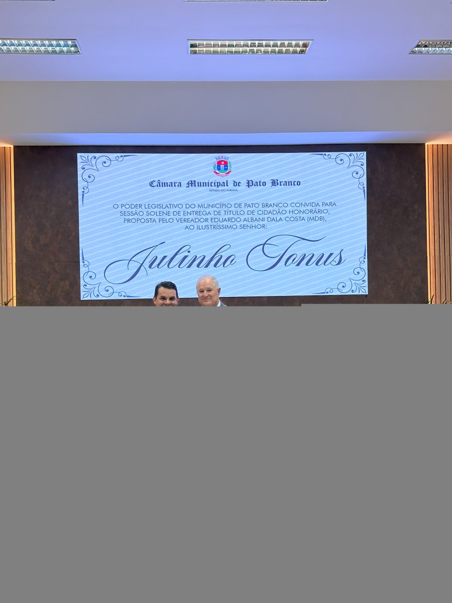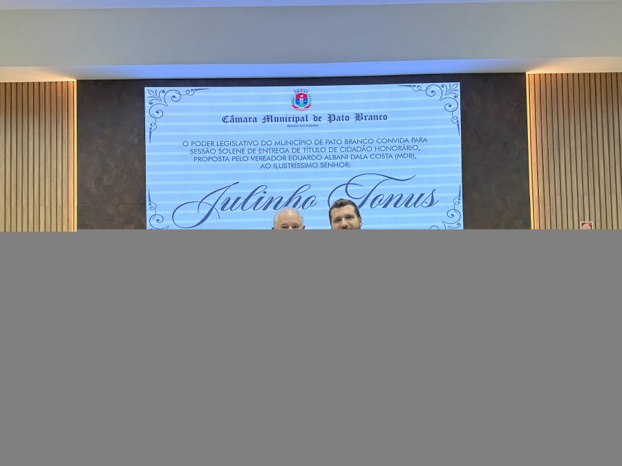 Para mais detalhes sobre a sessão solene, acesse: https://www.patobranco.pr.leg.br/institucional/noticias/legislativo-entregou-titulo-de-cidadao-honorario-de-pato-branco-para-julinho-tonus