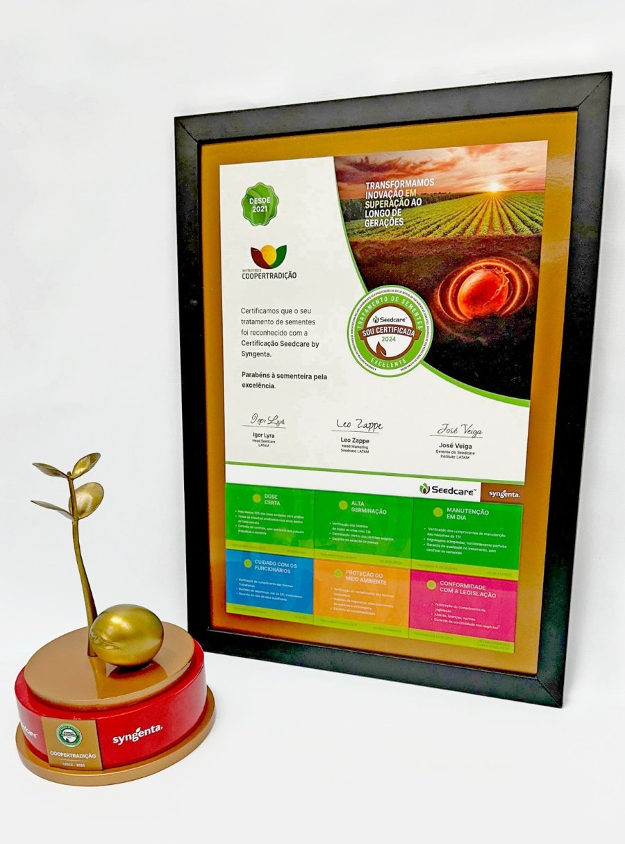 Pelo quarto ano consecutivo, a Sementes Coopertradição foi certificada pela Syngenta com o selo Seedcare Institute, um programa que certifica a excelência no tratamento de sementes industriais.