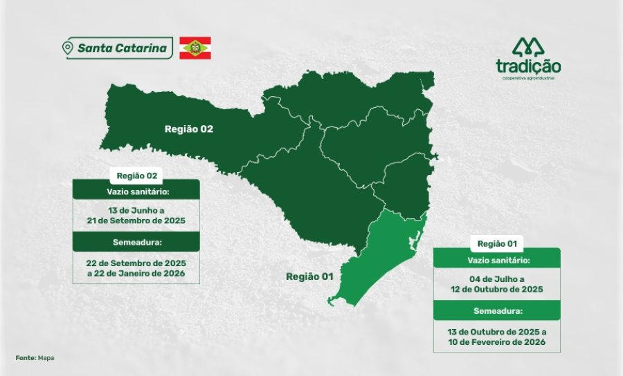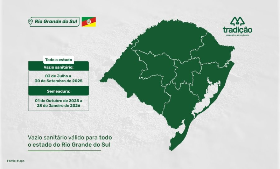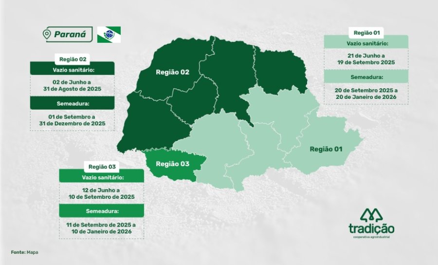A Cooperativa Agroindustrial Tradição informa aos seus cooperados os prazos definidos para o Vazio Sanitário e o calendário nacional de semeadura da soja, válidos para a safra 2025/2026.