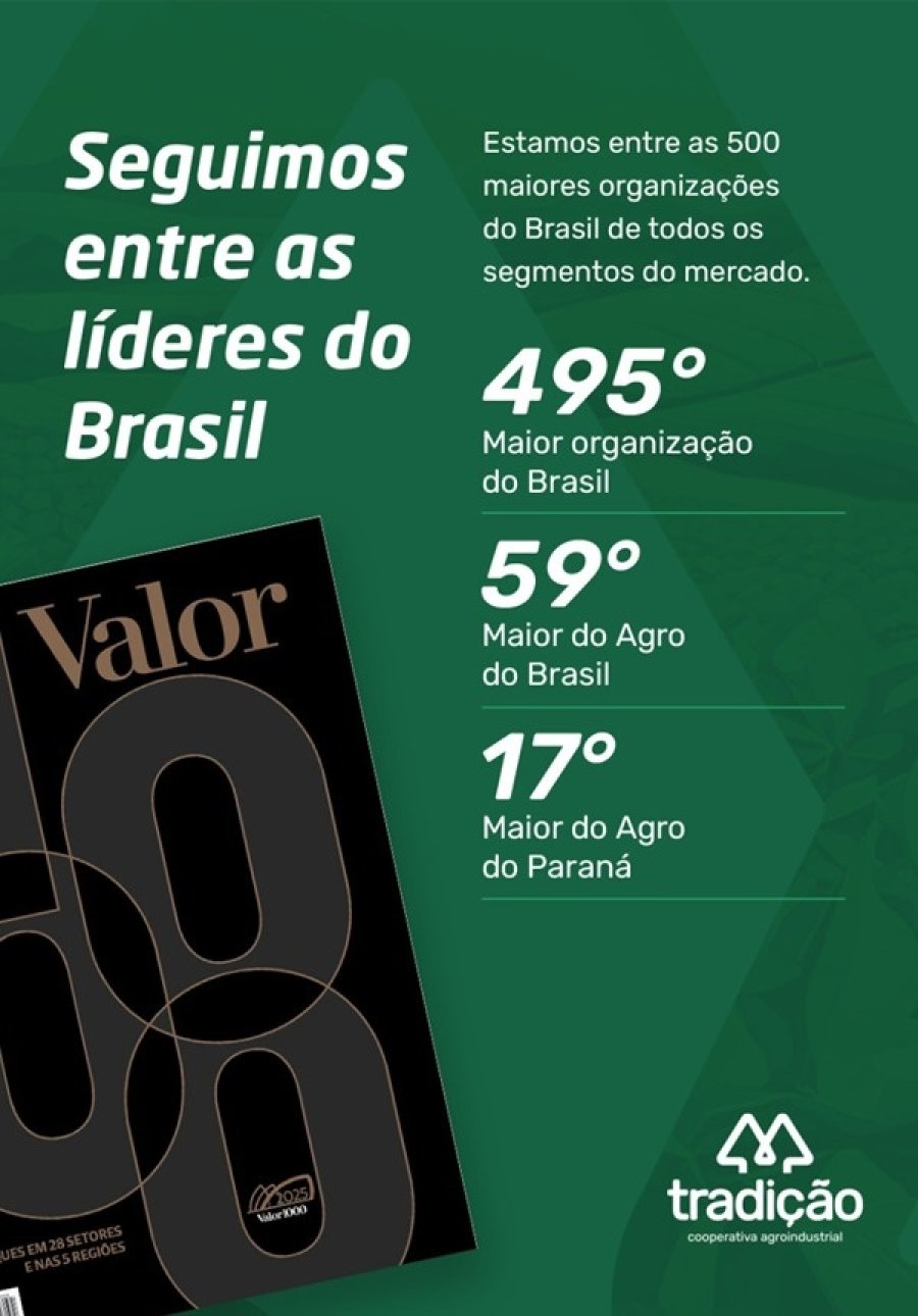 A Cooperativa Agroindustrial Tradição conquistou mais um marco importante em sua trajetória. Na 25ª edição do anuário Valor 1000, publicado pelo jornal Valor Econômico em parceria com a Serasa Experian e o Centro de Estudos em Finanças da FGV/SP, a organização aparece entre as 500 maiores empresas do país, ocupando a 495ª posição no ranking geral. No setor do agronegócio, alcançou o 59º lugar no Brasil e a 17ª posição no Paraná.