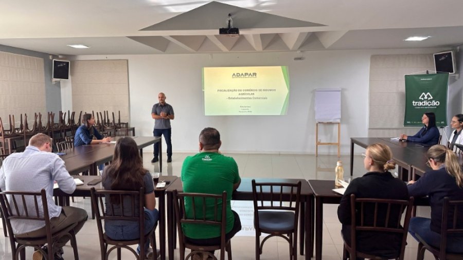 A Agência de Defesa Agropecuária do Paraná (Adapar) promoveu uma palestra de atualização sobre as normas de armazenamento de agroquímicos para colaboradores da Cooperativa Agroindustrial Tradição. A capacitação envolveu profissionais das áreas de Saúde, Segurança e Meio Ambiente (SSMA), além de representantes dos setores Comercial e de Logística. O treinamento foi conduzido pela fiscal da Adapar, Adriana Lazarotto.