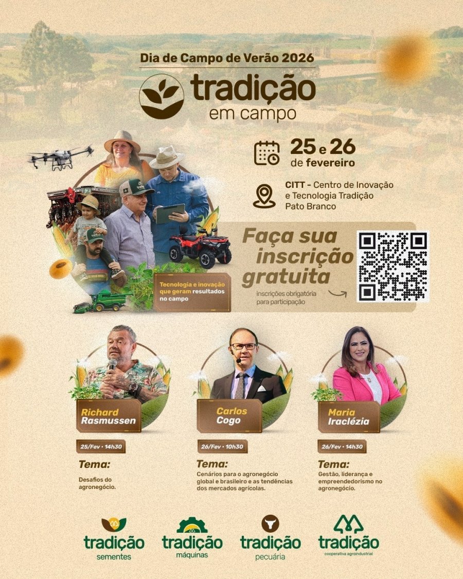 A Cooperativa Agroindustrial Tradição realiza, nos dias 25 e 26, o Tradição em Campo - Dia de Campo de Verão 2026, um dos principais eventos do calendário do agro regional. A programação acontece das 8h às 17h, no Centro de Tecnologia e Inovação Tradição, CITT, em Pato Branco, e reunirá cooperados, parceiros e a comunidade em dois dias de imersão em tecnologia, conhecimento e lançamentos 2026, além do fortalecimento das atividades no agronegócio.